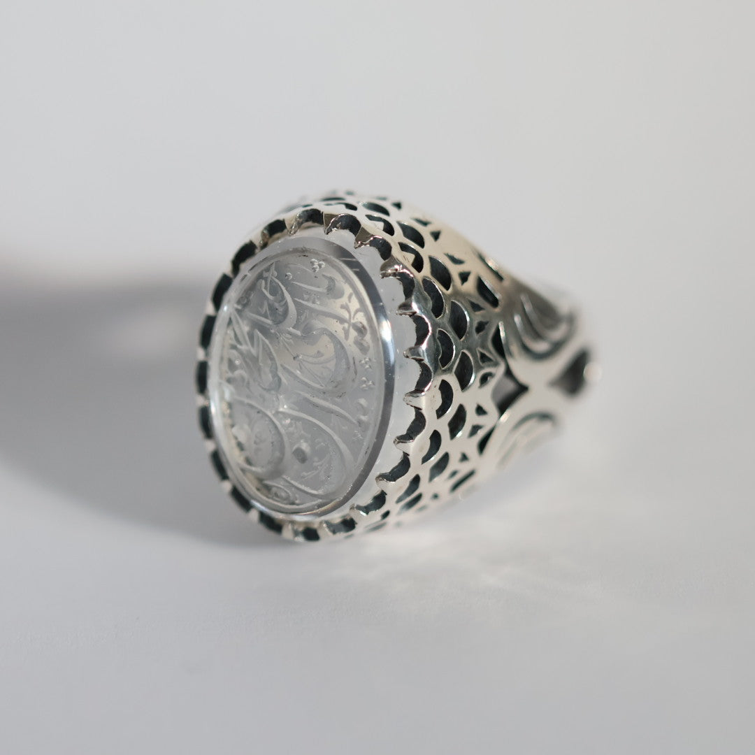The Asl al-Dur Najaf Sterling Silver Ring is crafted around a rare Dur Najaf (quartz), revered for its clarity, restraint, and grounding presence. Sourced from the Najaf region and hand-engraved with intricate Arabic calligraphy, this ring carries a quiet authority meant to be felt rather than announced. The engraving is rendered in an ornamental, artistic script inspired by devotional invocations traditionally associated with Imam Ali (peace be upon him). Rather than a literal inscription, the calligraphy reflects intention, strength, and reliance allowing the wearer to carry meaning without declaration. Dur Najaf has long been valued for its purifying and stabilizing qualities, believed to support mental clarity, emotional steadiness, and inner discipline. Paired with a substantial antique-finished sterling silver setting, this ring feels deliberate, grounding, and enduring. This is a one-of-a-kind piece, designed for those who understand presence, restraint, and symbolism and who value legacy over excess.