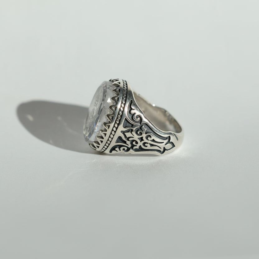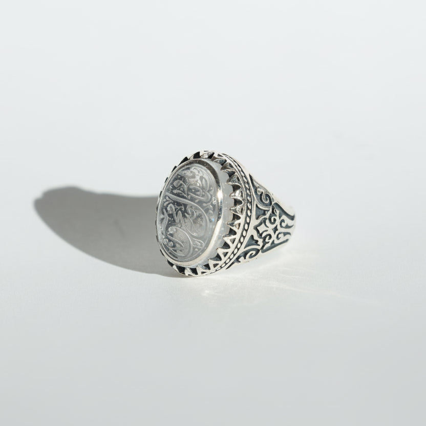 Crafted around a luminous Dur Najaf (quartz), this ring carries a presence that feels deliberate and deeply rooted. Quartz from Najaf has long been associated with clarity, balance, and spiritual steadiness qualities traditionally admired in men who lead with intention rather than force. The stone is engraved with ornate Arabic calligraphy inspired by the phrase “Ya Ali Madad,” a devotional invocation associated with seeking strength, guidance, and spiritual support. The calligraphy is intentionally rendered in an artistic, ornamental style rather than a strict literal form, allowing the engraving to function as a symbolic expression of reliance, resilience, and inner resolve. Set in genuine 925 sterling silver with an antique, hand-finished surface, this ring is solid, weighty, and unapologetically masculine. Its presence is felt the moment it is worn not as ornament, but as a personal anchor. This is a piece for those who value meaning, restraint, and spiritual alignment over trends or excess. Safwat al-Athar is not designed to be replaced or repeated. It is chosen once, worn with purpose, and kept as part of one’s personal legacy.