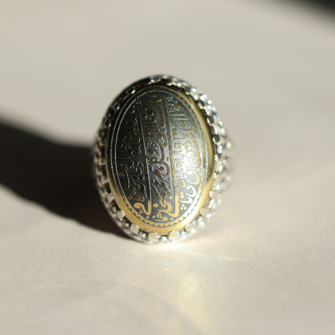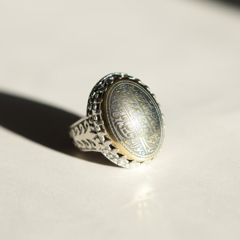 The Mazhar Al-Nusra ring is a commanding piece rooted in tradition, intention, and strength. Crafted with Hadeed Cheeni (hematite) and engraved with a revered segment of the Nade Ali supplication, this ring carries a presence that feels grounded, protective, and steady. Hematite has long been valued for its association with grounding, mental focus, and inner stability. Its dark, reflective surface anchors the wearer, encouraging balance, composure, and resilience in moments of pressure or uncertainty.